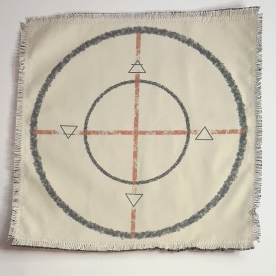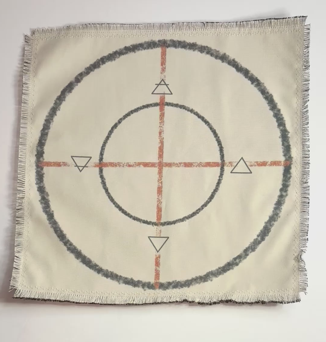 The design features a grounded circular layout with a centered cross and elemental markers, creating natural orientation for directional reading, spirit communication, and ancestral work. Whether you read bones intuitively or follow a structured system, this mat provides clarity without overpowering your practice. Crafted from soft yet durable fabric, the mat protects your bones, charms, altar, and tabletop without feeling stiff or slippery. It lays flat, folds easily, and travels well—perfect for home readings, client sessions, or ritual work on the go.