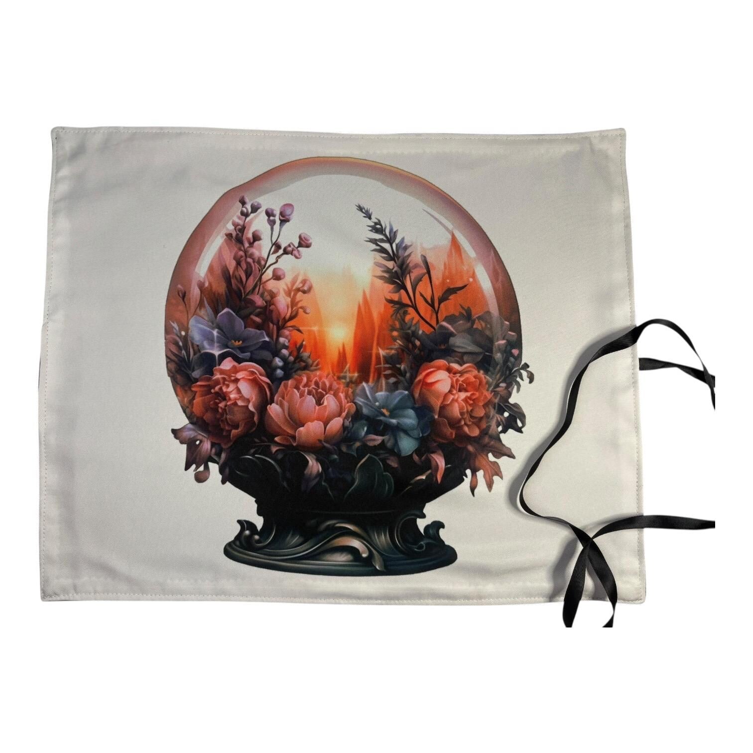 Handmade tarot deck wrap, a crystal ball filled with flowers with a wraparound tie—doubles as a reading mat, and fits most standard tarot & oracle decks. These handmade tarot deck wraps are designed to keep your cards protected, portable, and ready for use. Each one is sewn by me in my home studio in Mesa, Arizona.