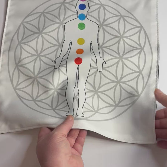 • Handmade reiki healing and chakra alignment mat • The mat is approx. 13.5”x13.5”, the flower grid is approx. 12.5”x12.5”, and the figure is about 11.5” tall • Smooth, high-quality poly-cotton fabric (soft, lustrous yet durable) • Standing figure with all seven chakra points in vibrant colors • Light gray Flower of Life sacred geometry background • Lightweight, flexible, and travel-friendly • Rolls or folds easily for storage or sacred space setup How It Works Lay the mat on a flat surface and position yourself on or near the standing chakra figure to meditate, align your centers, or perform energy work. Place corresponding crystals on each chakra for focused intention, create a small grid over the body for balance work, or hold a pendulum above each point to observe movement and flow. The Flower of Life pattern beneath it all creates a structured, harmonious backdrop, helping define your ritual space and visually anchor your practice. When you’re finished, simply roll or fold it and tuck it away until your next session.